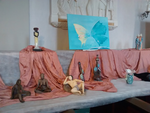 - Groepsexpositie samen met Chantal Sion lampenkappen gekleurd met natuurlijk materiaal en Tjeerd Schumacher met schalen en objecten van glas. Hier staan mijn dieren van keramiek: katten, puppy, gekke vogels en vaas met paarden.