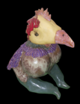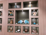 - In drie grote vitrines zijn keramieken beelden te zien. Bij de linker ingang (poly) staat een vitrine met vrolijke kleuren. Verderop een met abstracte beelden en boven o.a. Witte en grotere beelden.