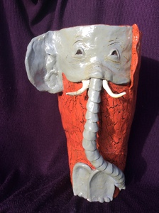 Grote vaas met een olifant erop; voor zijn kop en achter zijn billen en staart.