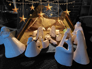 Kerststal met abstraherende beeldjes.