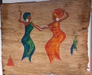 2024Indonesische Boomschors beschilderd met danseressen en versierd met kralen, kettingen e.d.